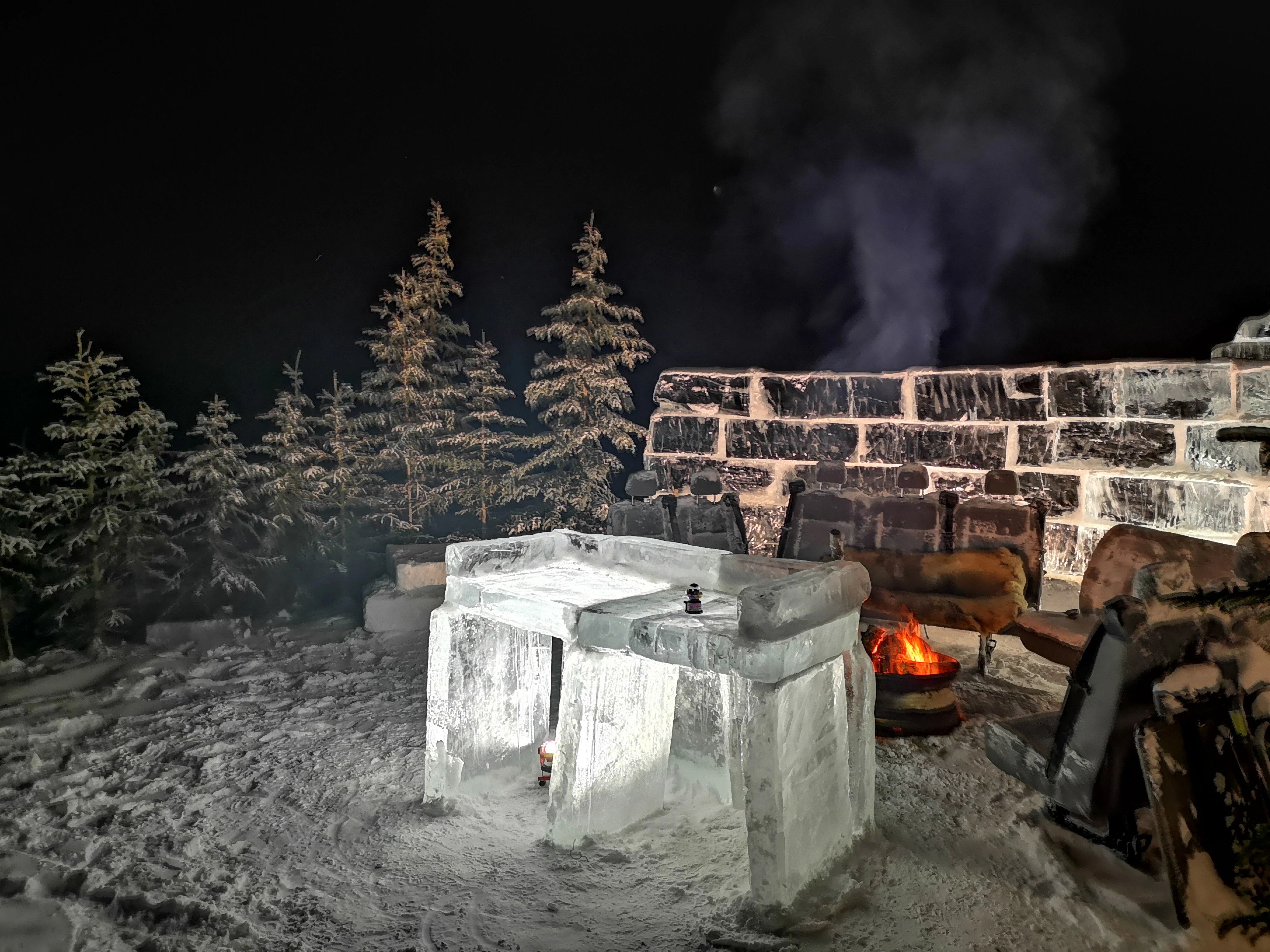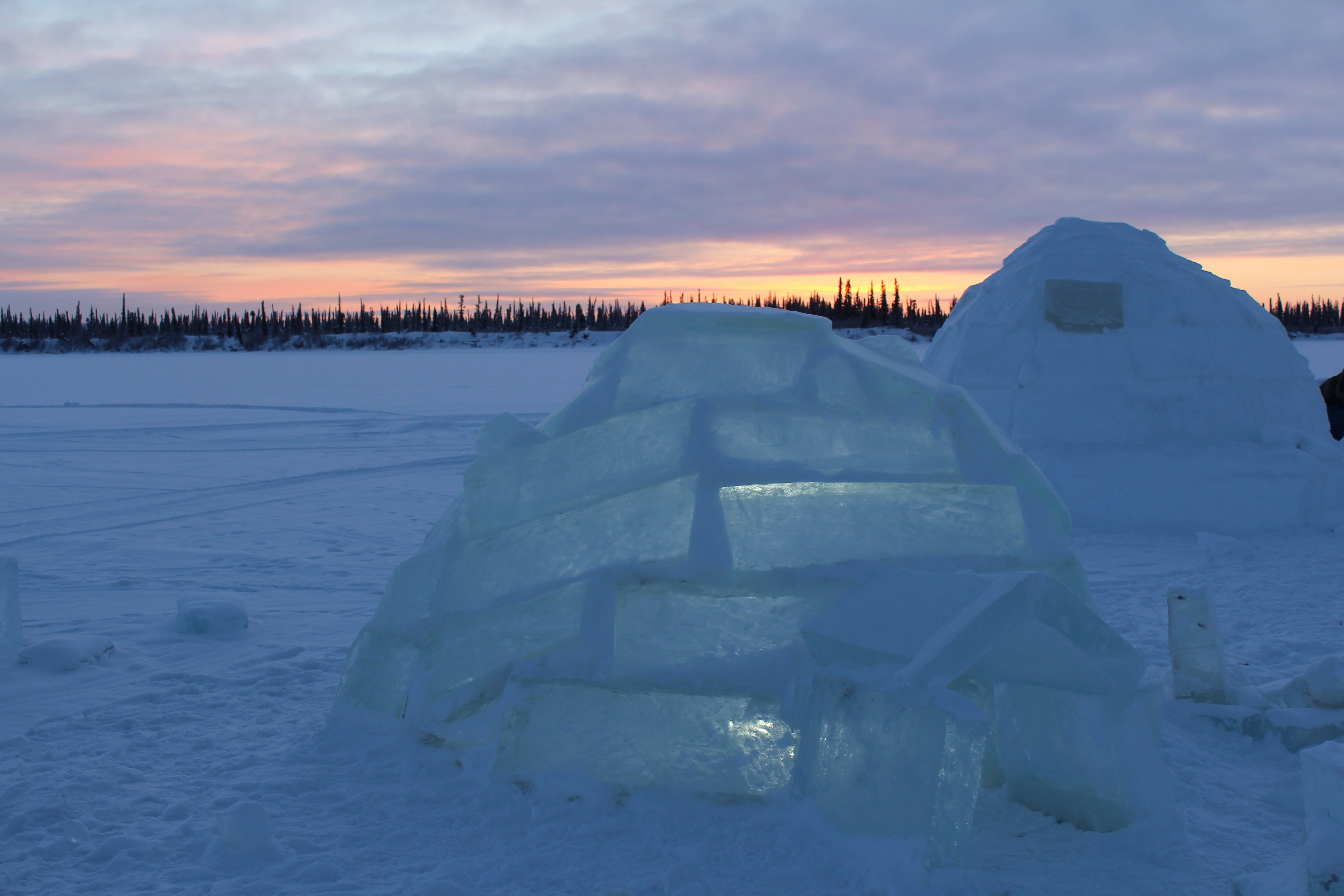 What do you do when you want to truly experience the great Northern Arctic Experience? You join Tundra North Tours’ Kylik Kisoun Taylor and spend the night in an igloo! After leaving the bus, we took a short-guided walk to see an icehouse where goods/food can be stored year-round. We were picked up by a snowmobile and taken to the igloo village that was built on a lake. The night spent in an igloo was an unforgettable experience and I would recommend it to everybody as well as doing it again anytime. The village had three igloos that were used for sleeping, one tent to relax/lounge and a cooking tent as well as a heated bathroom tent. They built an ice bar and a fire pit with chairs around it in the back as well.