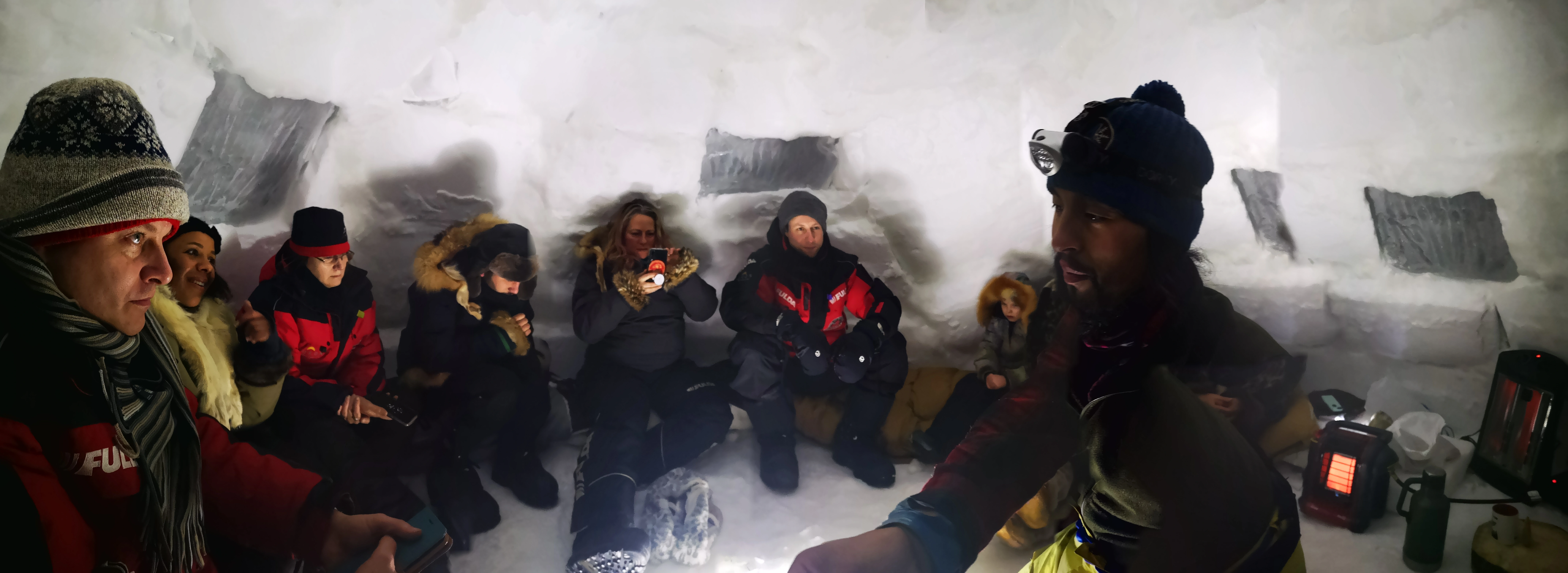 Afterwards, everybody except Fiona (my igloo mate) and I went to bed. I decided to postpone that as long as possible since I could not imagine the laying in the freezing space not being able to sleep. We had fun taking pictures and videos, eat ice cream and enjoyed the beautiful Aurora dance for hours. When we finally called it a night we taken all the heavy Arctic gear off bundled up in a sleeping bag (the sleeping bag was placed on heated blanket plugged into a generator) added few hand and feet warmers, covered our faces had lots of laughs and went to sleep. The only part of my body that was cold when I woke up was my nose since it was sticking out of the balaclava. Sleeping in an igloo was a great experience, but waking up in one, the next freezing morning, was another. By the time I got out of the sleeping bag and put all my gear on and climbed out of the igloo my hands were completely frozen!